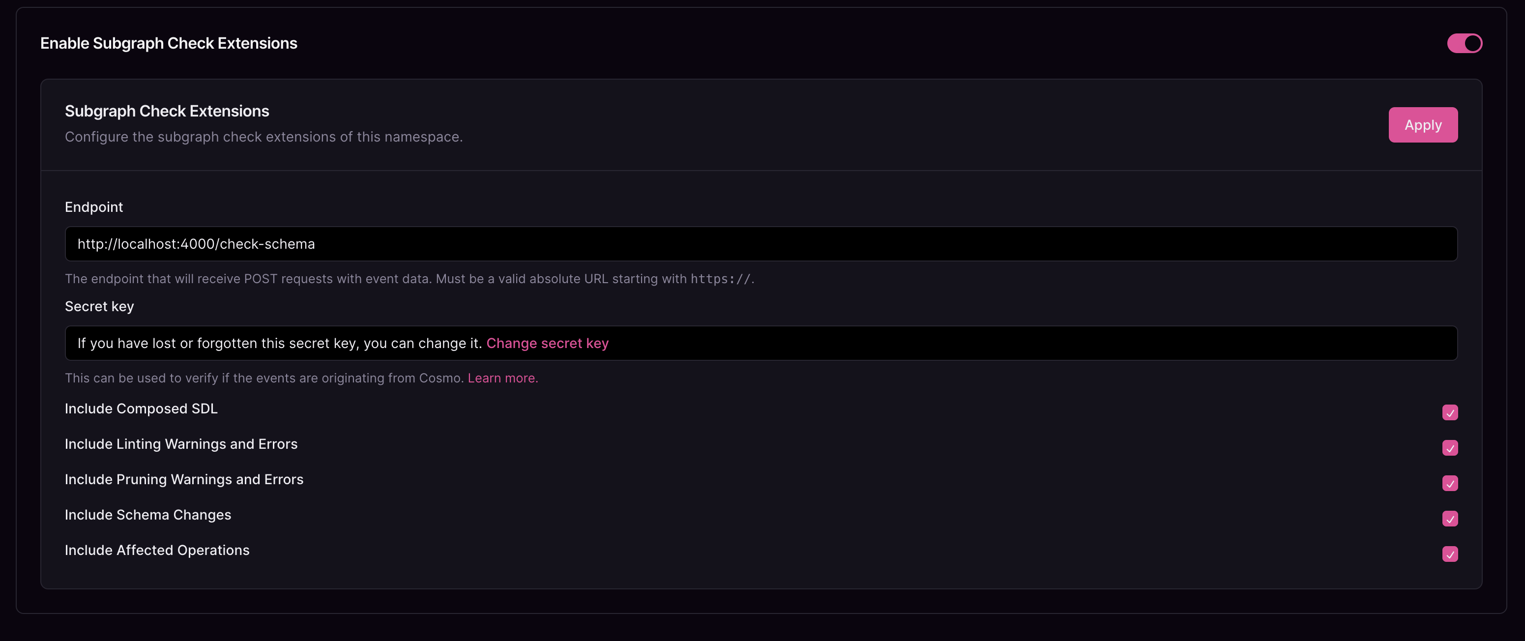 | Include Composed SDL | When enabled, both the previous and current SDL (Schema Definition Language) versions are sent to your service. | |